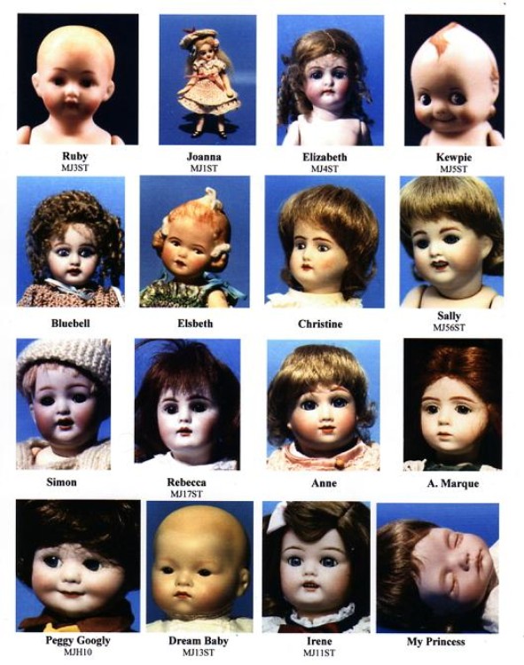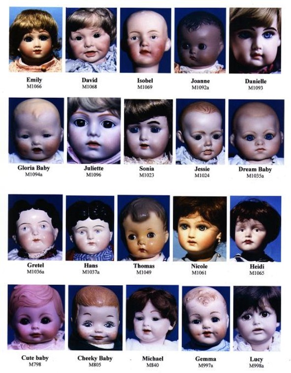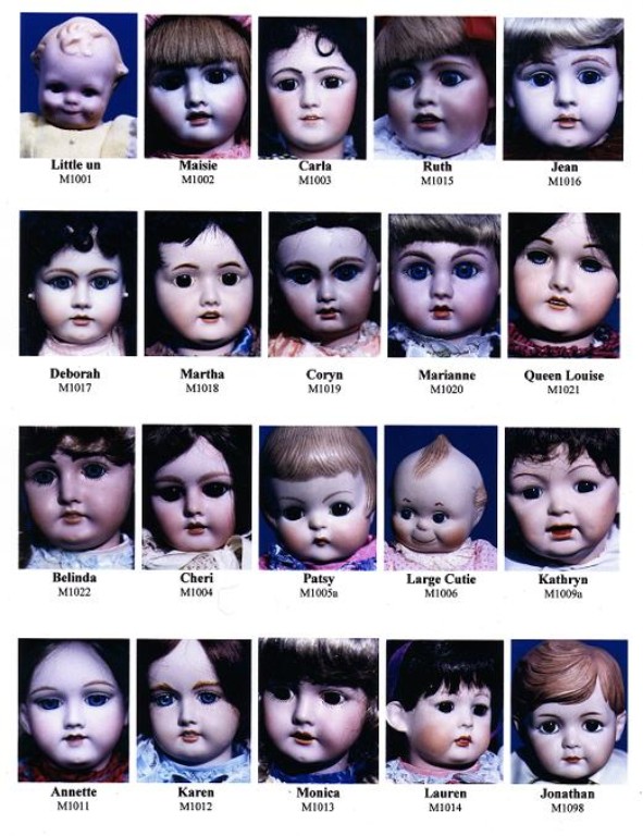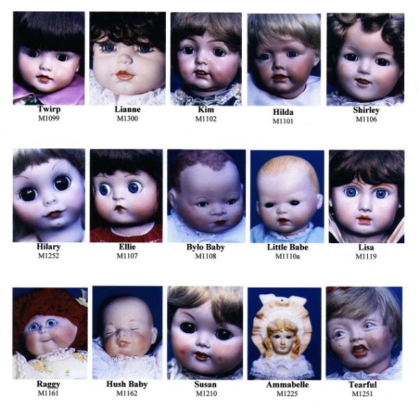 All of the dolls shown below are available in mould form. We have shown the heads, we also have body moulds, arm, leg and should plate moulds to fit all of the heads. Many body moulds fit more than one head. The moulds can be poured in porcelain, composition fluid or in wax. Moulds are made in good quality plaster and are very durable. Moulds are made by hand at the studio.